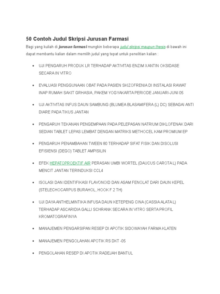 Ada banyak judul skripsi Farmasi yang dapat kamu pilih ataupun dapat kamu gunakan sebagai referensimu dalam mengerjakan skripsi. Jakarta 1431 h 2010 m. Selengkapnya lihat dibawah ini.